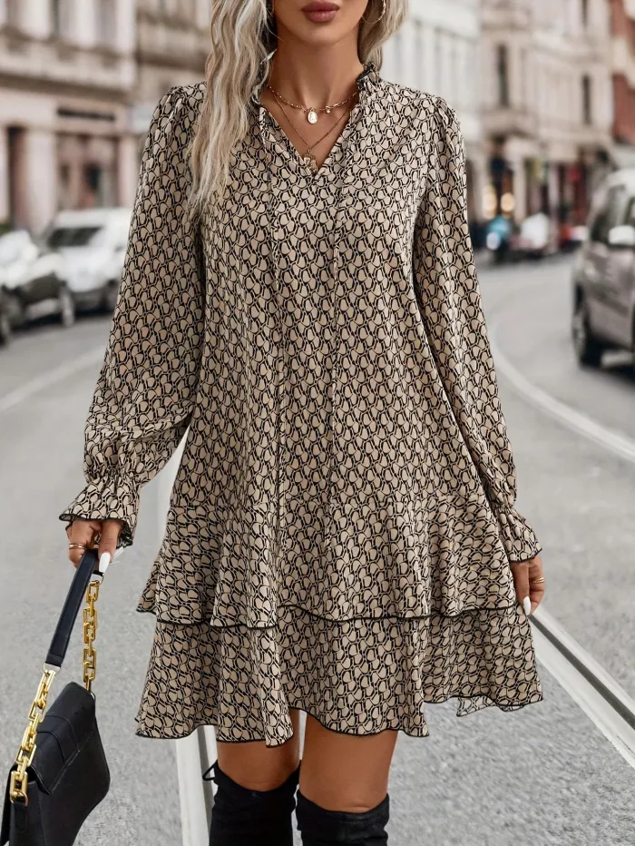 Allover Print Layered Dress, Elegant V Neck Long Sleeve Dress, Women's Clothing